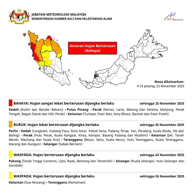 Monsun Timur Laut yang membawa hujan lebat terutamanya kepada negeri-negeri di pantai timur Semenanjung Malaysia telah pun bermula. Jabatan Meteorologi juga telah mengeluarkan amaran siap siaga banjir yang dijangka berterusan sehingga awal Januari.