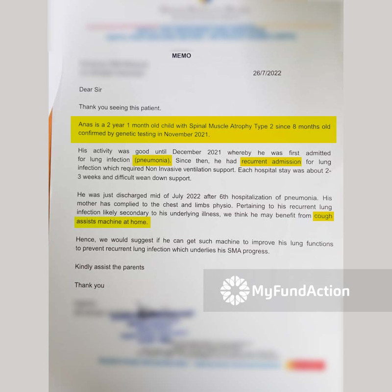 Doktor yang merawat Anas beritahu, Anas sangat memerlukan Cough Assist Machine atau mesin bantuan batuk untuk pastikan paru-paru dia dalam keadaan stabil.