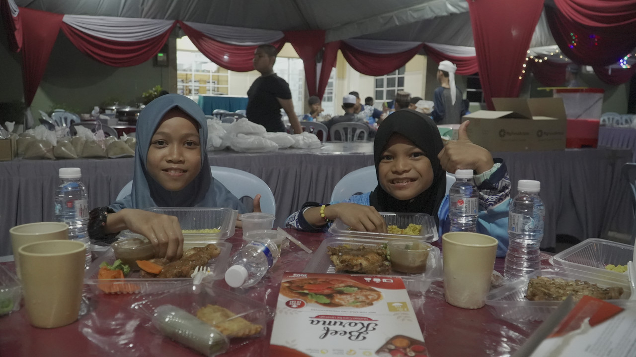Sekumpulan kanak-kanak sedang menjamu juadah berbuka di Masjid yang dibina oleh #jiwabaik MyFundAction