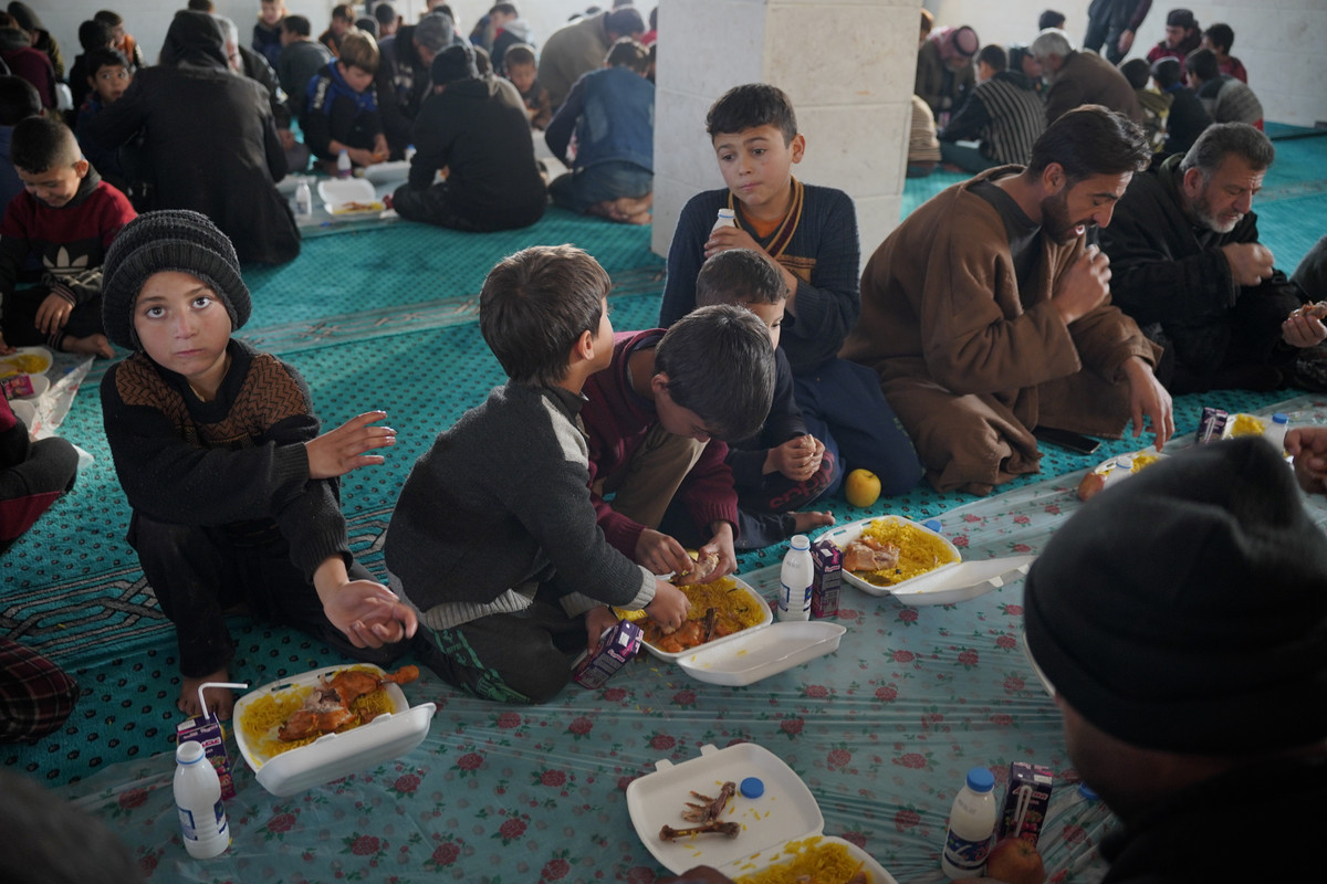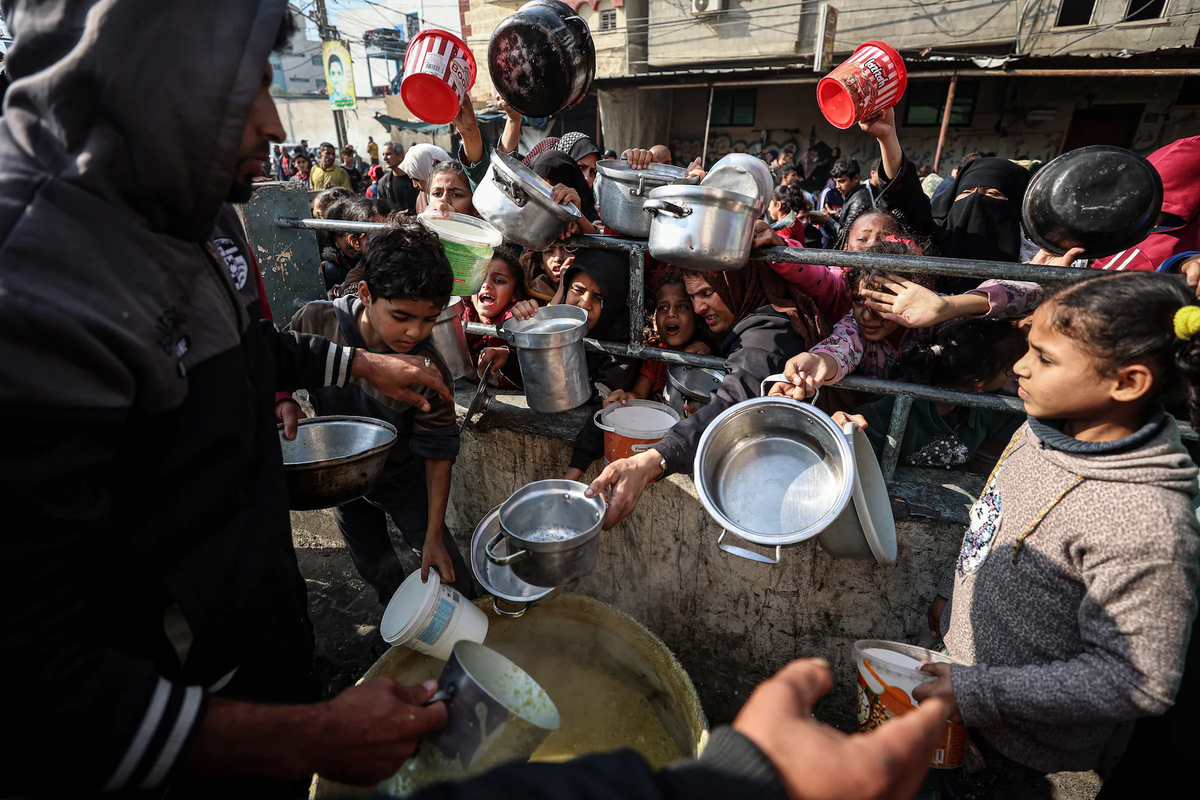 Penduduk yang dipindahkan akibat perang antara Israel dan Hamas menunggu untuk mendapatkan semangkuk sup kacang dal . Gambar: Loay Ayyoub/ Washington Post