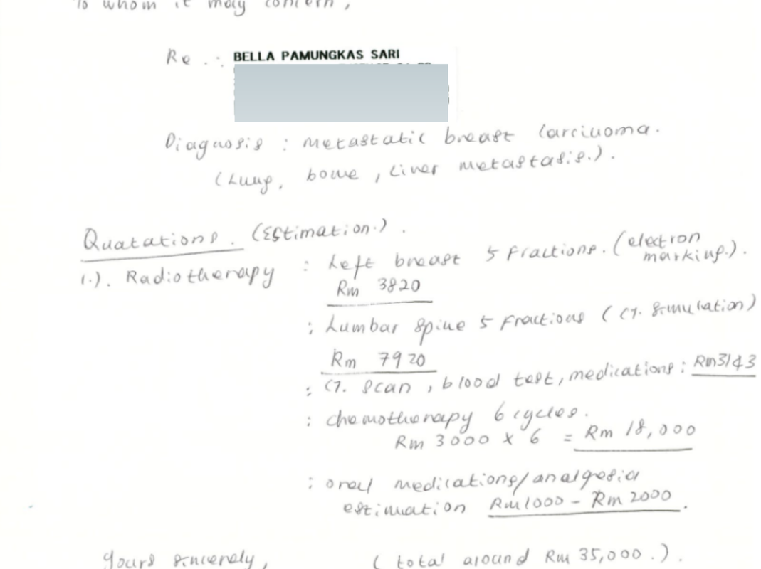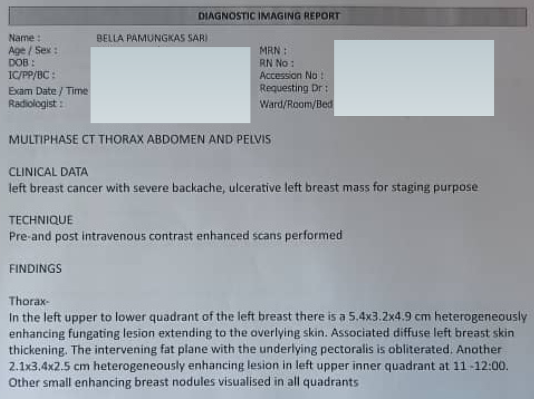 September 2024, Bella mula perasan ada ketulan bersaiz 2x duit syiling 50 sen di payudara kirinya namun tiada rasa sakit.